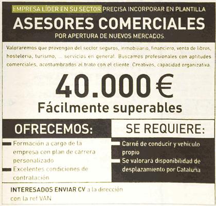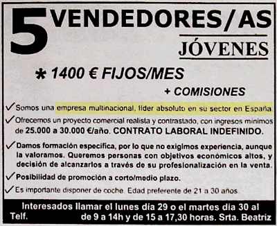 Todos sabemos que detrás de este eufemismo se esconde una sarta de mentiras las cuales reflejan la precaria realidad de muchas empresas que operan a lo largo y ancho de nuestra geografía. Como norma general: Nunca te fíes de una empresa que no ponga su nombre en un anuncio de empleo.